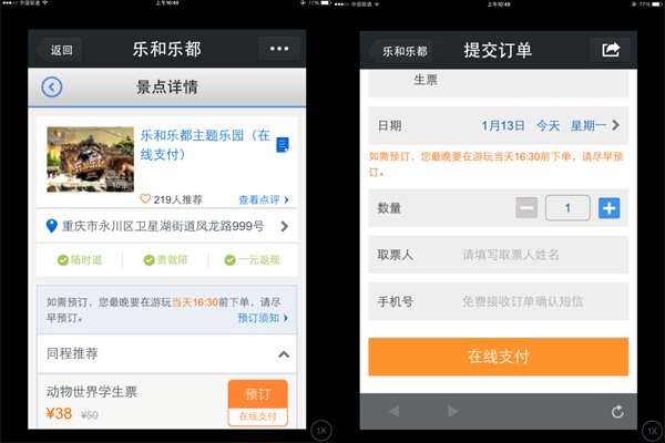 乐和乐都官方微信最大的亮点之一,是实现便捷的微支付功能。用户点击在线预订菜单进入景点详情页并填写订票数量、取票人、手机号码等信息,根据客户需求,用户提交订单后将进入同程网支付页面,完成交易