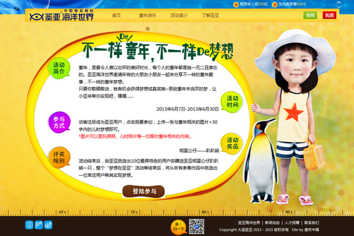 由大连圣亚海洋世界举办的“带着梦想玩圣亚之不一样的童年”在各位大小盆友的热情参与中,划下一个欢乐的圆点。大连圣亚海洋世界自从升级了新形象后,在旺季来临前,希望通过线上的活动传播,通过整合营销使品牌影响力得到扩散,并促成销售。