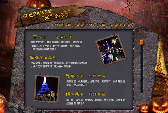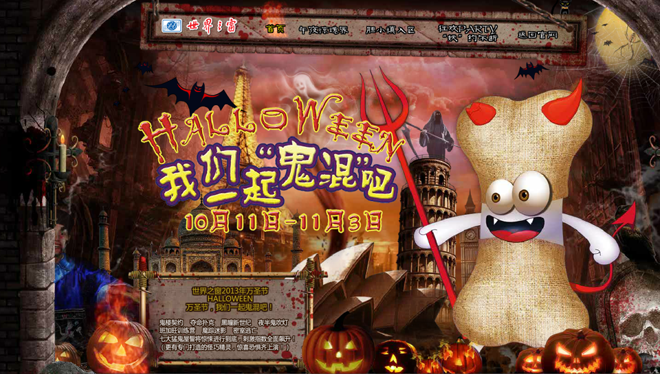 页面设计充分展示出万圣节搞鬼作怪的主题,画面体现万圣节鬼怪、惊吓的主题。让游客在世界之窗一次鬼混个够,不断挑战游客的心理极限,让游客一路尖叫,一路high到爆~