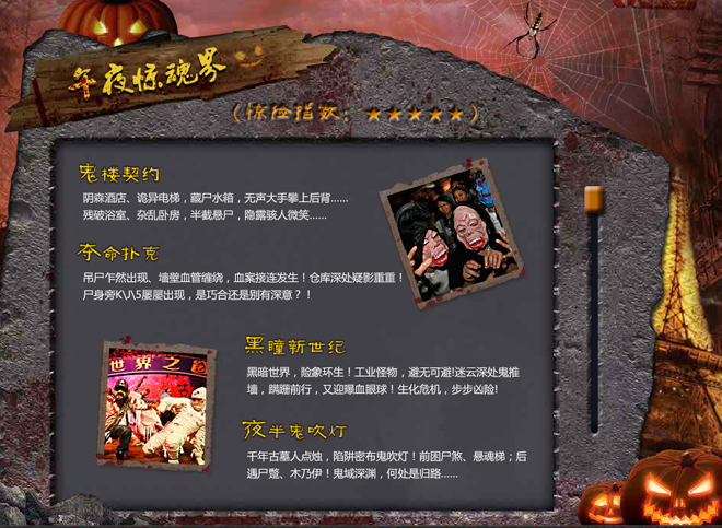 网页的导航栏划为首页、午夜惊魂界、胆小慎入区、狂欢PARTY“妖”约不断、返回官网,清晰明确的栏目划分,游客可以根据个人心理承受能力选择挑战项目。设计人性,页面动态感十足。