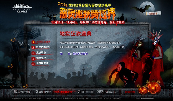 欢乐谷第六届万圣节“恶灵邀妖跨过界”的主题活动,是唐宋中国又一定制的主题活动设计页面以恐怖、冷暴力的视觉冲击做专题活动页面设计,吸引年轻以及喜爱探险的目标人群关注。
