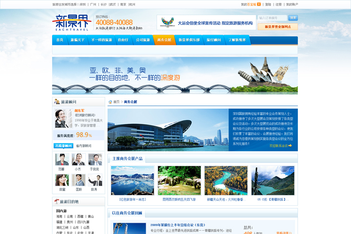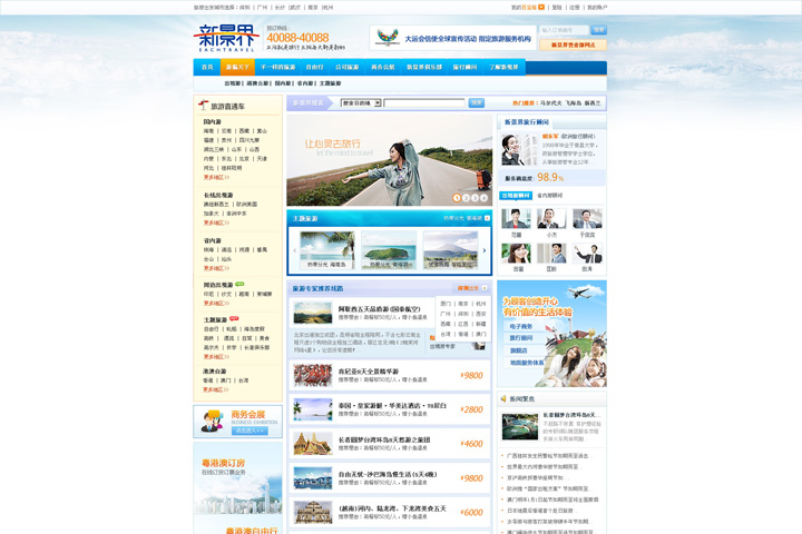 新版网站的界面设计非常大气,充份展示了新景界的品牌实力。针对不同的目标人群,规划了游遍天下、不一样的旅游、自由行、公司旅游、商务会展等栏目。