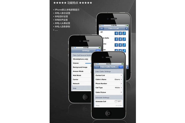 下载该应用的iPhone用户可进行默认来电屏幕显示、来电人身份设置、来电定时设置、来电铃声设置、来电人头像设置、来电人语音录制等多种功能的设置;这个应用不提供真实的通话功能,但能够简单、迅速地模仿一个“真实”的来电,让一个您最希望的人及时给您拨打电话,逃避各类你所需要及时解围和脱身的境遇;此外,该应用还是最有趣、最搞笑的娱乐道具,通过设置,你的iPod、Touch;可瞬间变成未来即将发布的iPhone5F, 你的iPad摇身一变就成了超大版的“iPhone”手机,带给您无限搞怪乐趣!