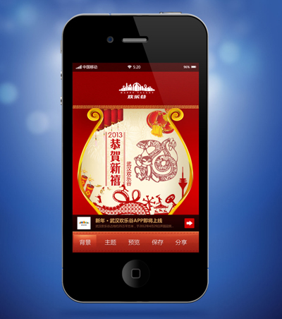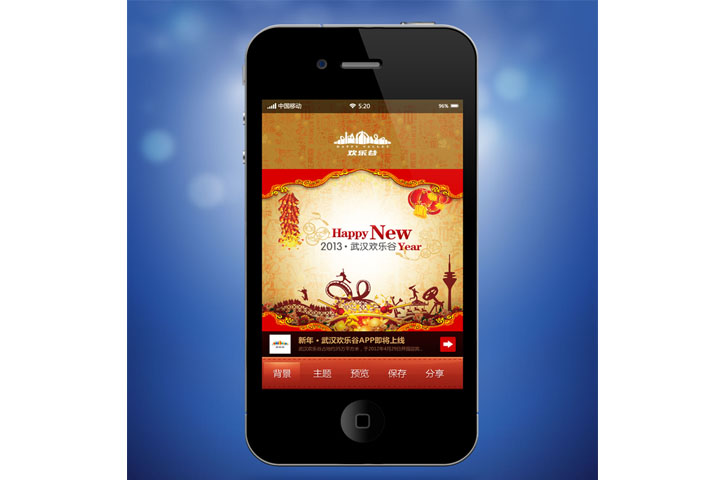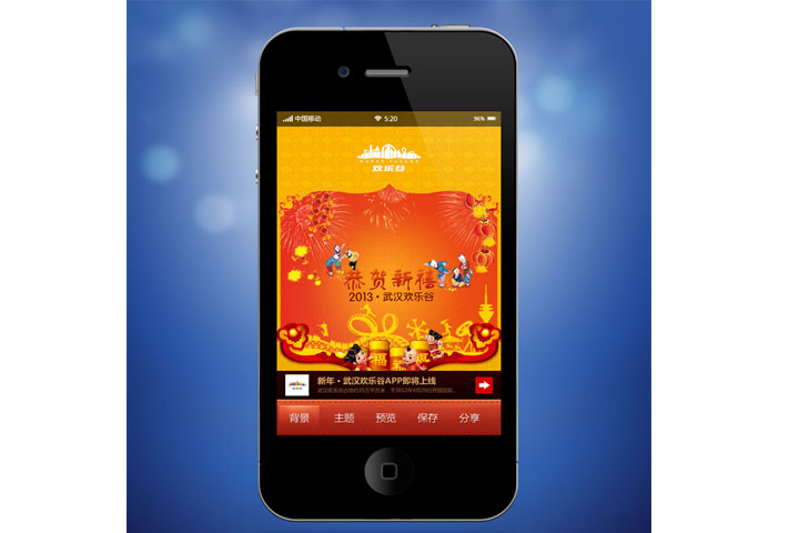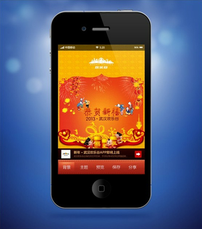 “新年•武汉欢乐谷”这款APP最大的亮点在于,它是根据单个活动主题进行独立制作的,抛开了其他旅游景区APP以大量枯燥、实用性信息为主的风格,唐宋中国开发团队将应用的侧重点放于生动的用户趣味DIY体验上,通过引导用户动手操作,慢慢将其转化为潜在客户,从而达到品牌营销目的。当用户在兴致勃勃地给自己手机搭配各种主题背景或将精美桌面分享给好友时,已经不知不觉陷入我们的品牌营销圈套了。